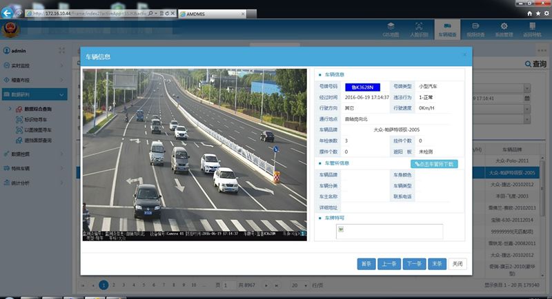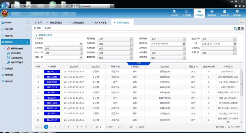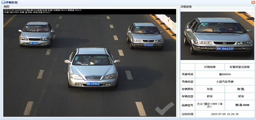 在此功能中,用户可以查询到所有电子卡口捕捉过的图像,并能查询到车辆的号牌、号牌类型、经过时间、违法行为、行驶速度、通行地点、车辆品牌等信息,同时还可以下载车管所登记的信息对比看是否有违法违章行为。