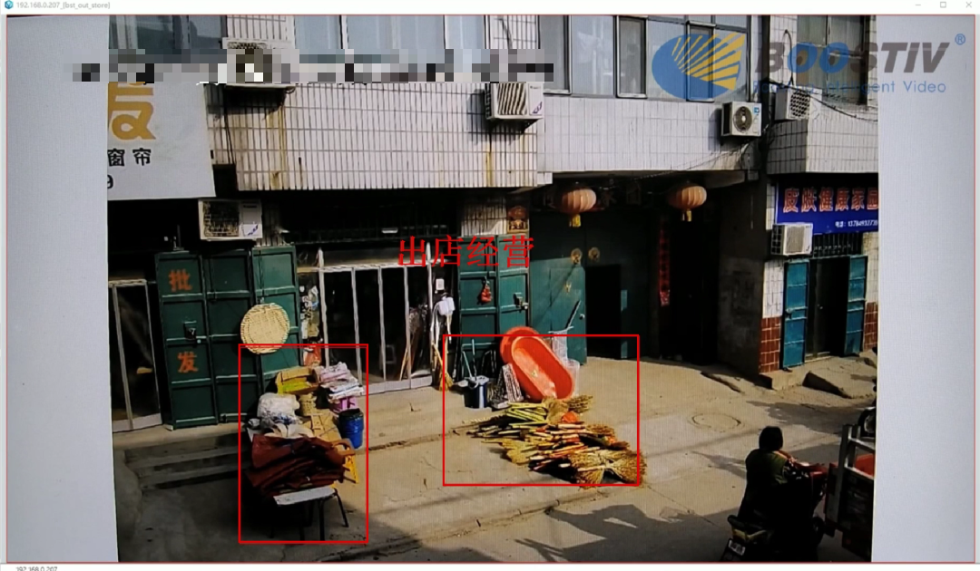为协助城管部门高效治理店外经营现象,博思廷配合华为软件定义摄像机推出了智慧城管之店外经营检测”算法,通过高精度深度学习的目标检测算法,高准确率检测设定区域中是否存在临街商铺在店铺门外道路上摆摊经营情况,若发现则实时现场语音提醒当事人改正,亦可向城管部门远程告警提示,并提供具体位置的截图与短视频备查。算法可帮助城管部门提高监管效率,高效治理出店经营现象,引导户外商户正常进店经营。