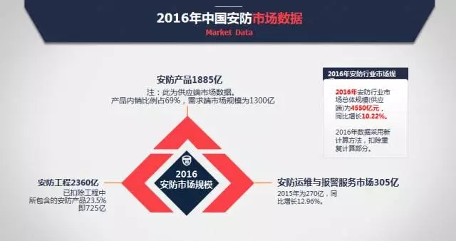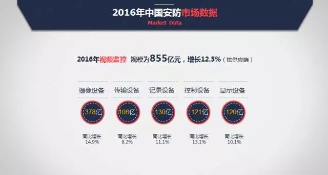 据慧聪安防网统计,2016年我国安防行业市场总体规模(供应端)达到4550亿元,同比增长10.22%;视频监控行业市场总体规模(按供应端)达到855亿元,同比增长12.5%。随着政府政策的支持力度、国内安防技术的整体提升,可以看出安防市场仍然处在快速发展阶段。