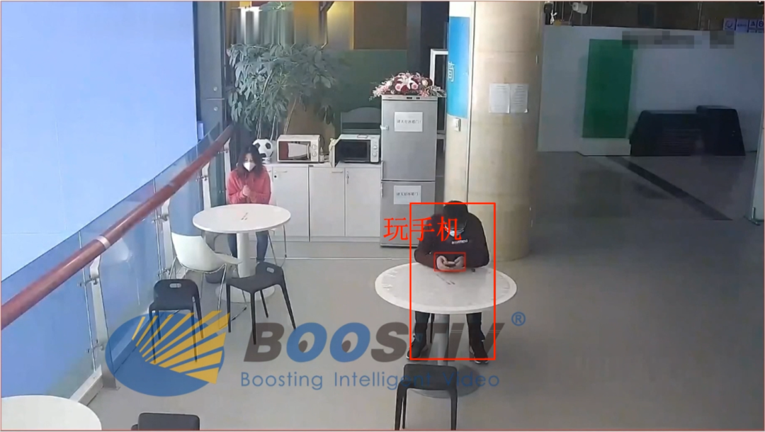 为助力管理方高效管理人员玩手机行为,博思廷配合华为软件定义摄像机推出了“玩手机检测”算法,通过高精度深度学习的目标检测算法,高准确率检测指定工作区域是否有人员有玩手机行为,若发现可及时现场语音劝阻当事人,亦可实时向管理方远程告警提示管理人员干预处理,并提供截图与短视频备查。算法可帮助管理部门提高监管效率,避免人员因注意力分散导致玩忽职守或降低服务质量,带来安防、消防等事故。